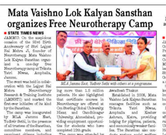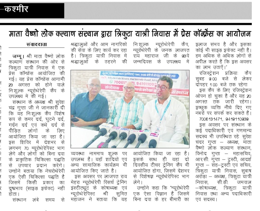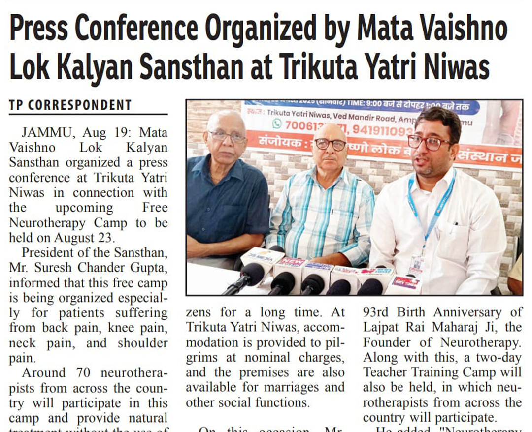माता वैष्णो लोक कल्याण संस्थान ने निःशुल्क न्यूरोथैरेपी कैंप का आयोजन किया, जिसमें संस्थान द्वारा स्वास्थ्य जागरूकता, उपचारात्मक सेवाओं और नई जनकल्याणकारी पहल से संबंधित जानकारी साझा की गई। उपस्थित लाभार्थियों के प्रश्नों का उत्तर देते हुए संस्थान ने सभी वर्गों तक निःशुल्क उपचार और समर्पित सेवा पहुँचाने की अपनी प्रतिबद्धता दोहराई।