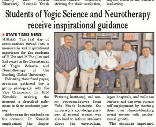 योगिक विज्ञान और न्यूरोथैरेपी के छात्रों के लिए एक प्रेरणादायक सत्र आयोजित किया गया। सत्र में विशेषज्ञों ने मार्गदर्शन, अनुभव और सफल शिक्षण पद्धतियों को साझा किया। छात्रों ने सक्रिय रूप से प्रश्न पूछे और आगे के अध्ययन के लिए प्रेरणा प्राप्त की। आयोजकों ने छात्रों को कौशल विकास और करियर उन्नति के लिए निरंतर प्रयास करने के लिए प्रोत्साहित किया।