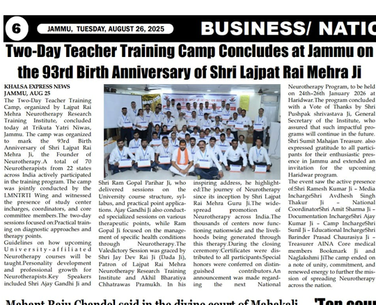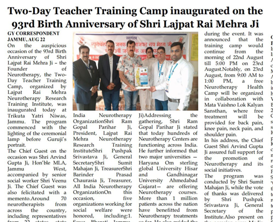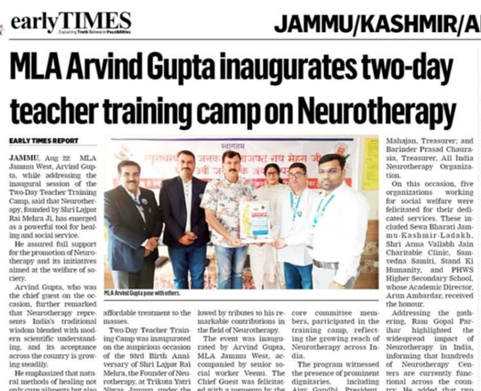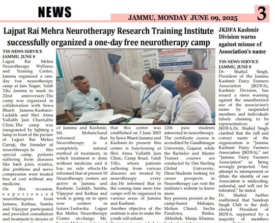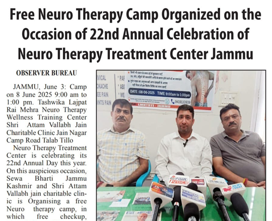 जम्मू में न्यूरोथैरेपी ट्रीटमेंट सेंटर के 22वें वार्षिक समारोह के अवसर पर निःशुल्क न्यूरोथैरेपी कैंप का आयोजन किया गया। कैंप में विशेषज्ञों ने न्यूरोथैरेपी तकनीकें, उपचार, स्वास्थ्य जागरूकता और स्वास्थ्य सुधार उपाय साझा किए। आयोजकों ने सभी वर्गों तक निःशुल्क चिकित्सा और स्वास्थ्य जागरूकता पहुँचाने की प्रतिबद्धता जताई।