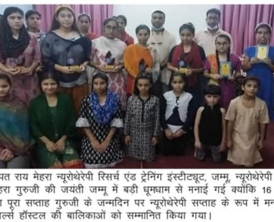 लाजपत राय मेहरा न्यूरोथेरेपी रिसर्च एंड ट्रेनिंग इंस्टीट्यूट, जम्मू, न्यूरोथेरेपी के संस्थापक लाजपत राय मेहरा गुरुजी की जयंती जम्मू में बड़ी धूमधाम से मनाई गई क्योंकि 16 अगस्त से 23 अगस्त तक का पूरा सप्ताह गुरुजी के जन्मदिन पर न्यूरोथेरेपी सप्ताह के रूप में मनाया गया। इस दौरान दृष्टि गर्ल्स हॉस्टल की बालिकाओं को सम्मानित किया गया।