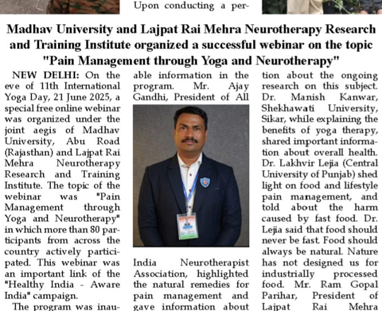 21 जून 2025 को 11वें अंतरराष्ट्रीय योग दिवस पर माधव विश्वविद्यालय और LMNTRTI ने “योग एवं न्यूरोथेरेपी के माध्यम से दर्द प्रबंधन” पर राष्ट्रीय स्तर का वेबिनार आयोजित किया। 80+ प्रतिभागियों ने भाग लिया और योग, ध्यान व न्यूरोथेरेपी के वैज्ञानिक दृष्टिकोण पर चर्चा की। कार्यक्रम ने दवा-मुक्त स्वास्थ्य समाधान और जागरूक समाज निर्माण के लिए प्रेरणा दी।
